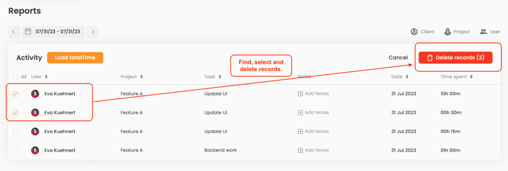 Find and delete time tracking entries, one or multiple at the same time. Just activate the “Delete records” next to the .csv export button, select the records you want to delete and then confirm with the red “Delete records” button.